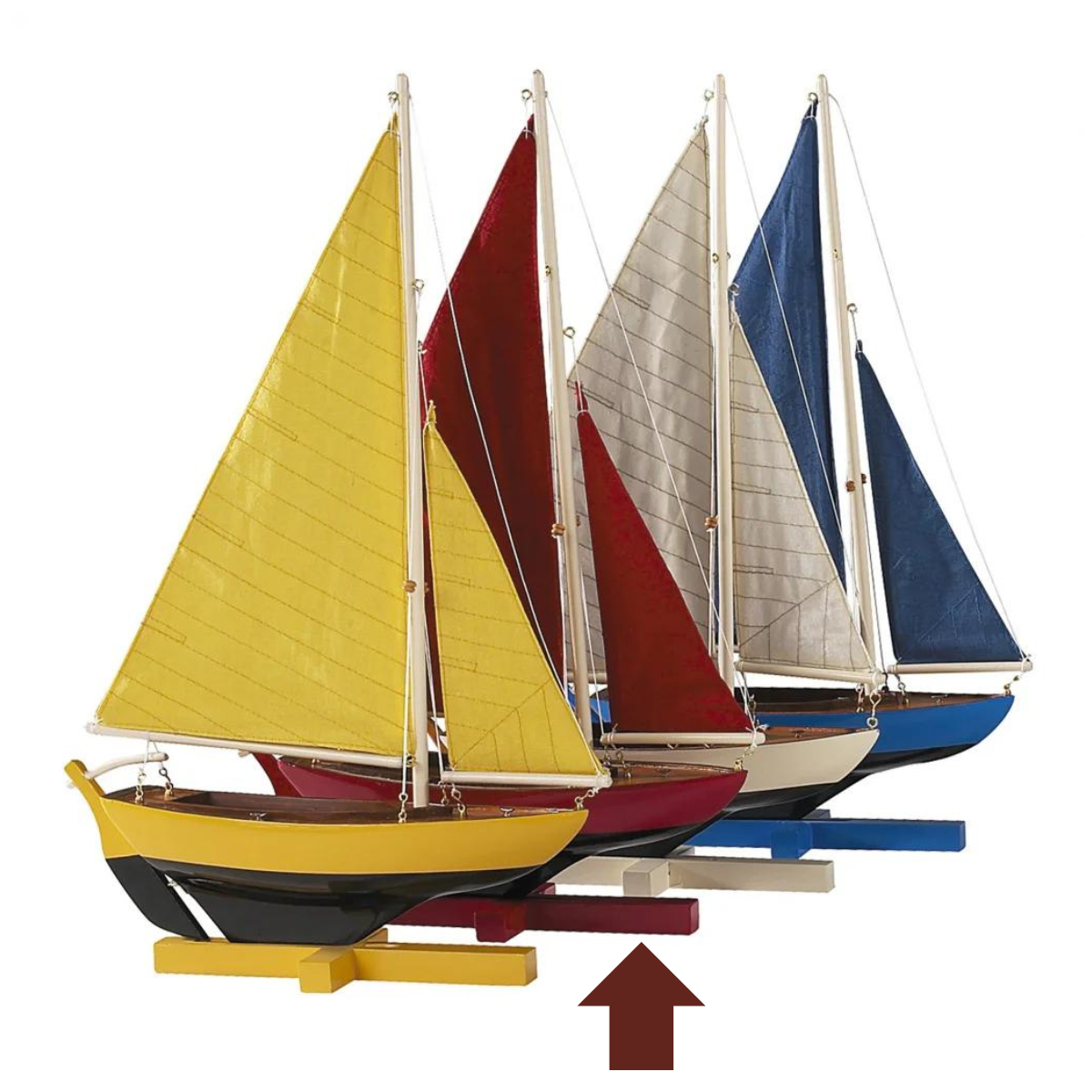 Den fineste delen av en dag på vannet er å returnere til havn. Sol lavt over horisonten, litt søvnig, klar til å legge til kai, ta seilene ned, rusle hjem og nyte en kald øl. En håndbygd treflotilje av en seiljoller i frisk farge. Kommer i 4 ulike farger.