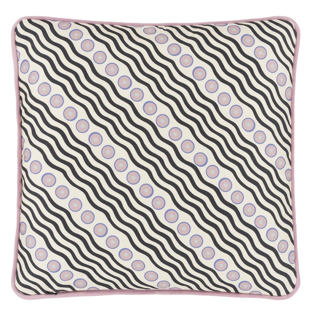 L’artiste! En livlig pute av Christian Lacroix Maison. Digitalt trykt på ren bomullsateng med grafisk mønster på baksiden. Rosa fløyelspiping i sidene.