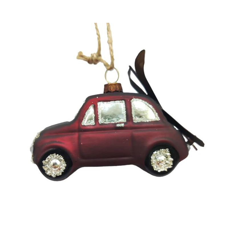Bil med ski på bagasjebrettet. Ornament til å henge på juletreet.