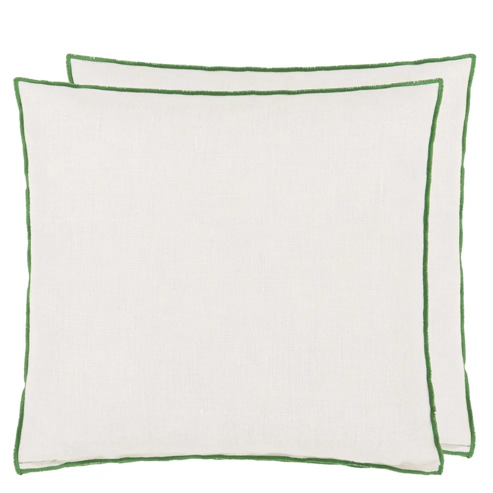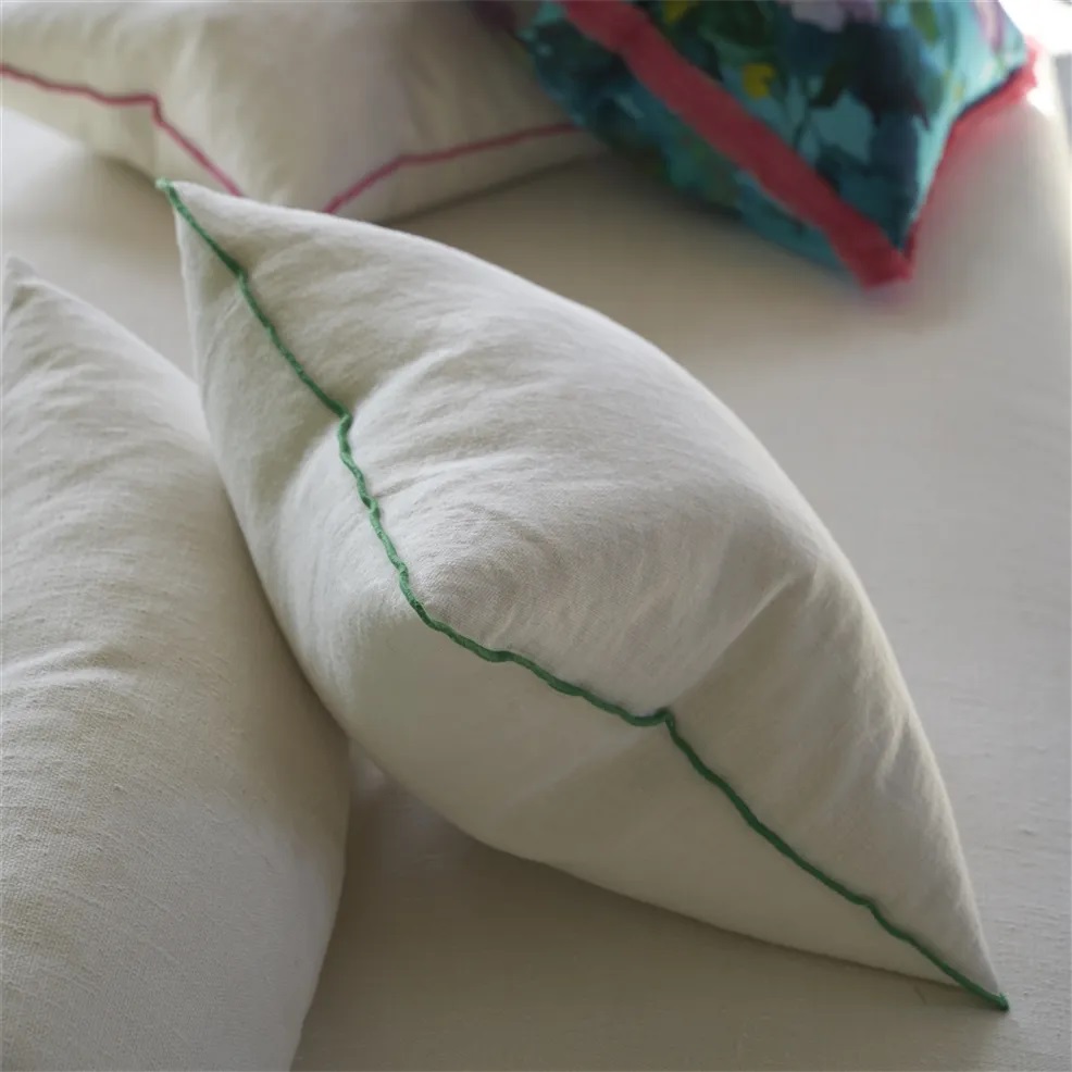 Hvit pute i ren, vasket lin med en moderne enkel overlocked kant på alle fire sider. Den perfekte linputen for ethvert interiør.