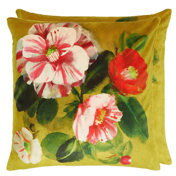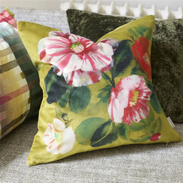 Denne vakre puten har et kunstnerisk motiv av blomster og løvverk som fremkaller den naturlige skjønnheten til kameliablomsten og dens blader. Digitalt trykt på luksuriøs fløyel, i levende fuchsia-toner mot en mimosa-gul bakgrunn. Denne store, vendbare puten i fløyel er kantet med en olivenfarget «Calozzo»-bånd på to av sidene.