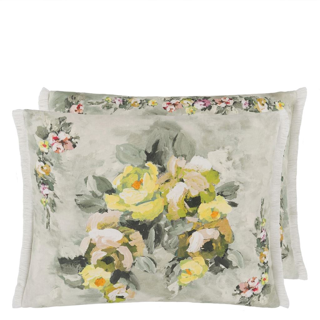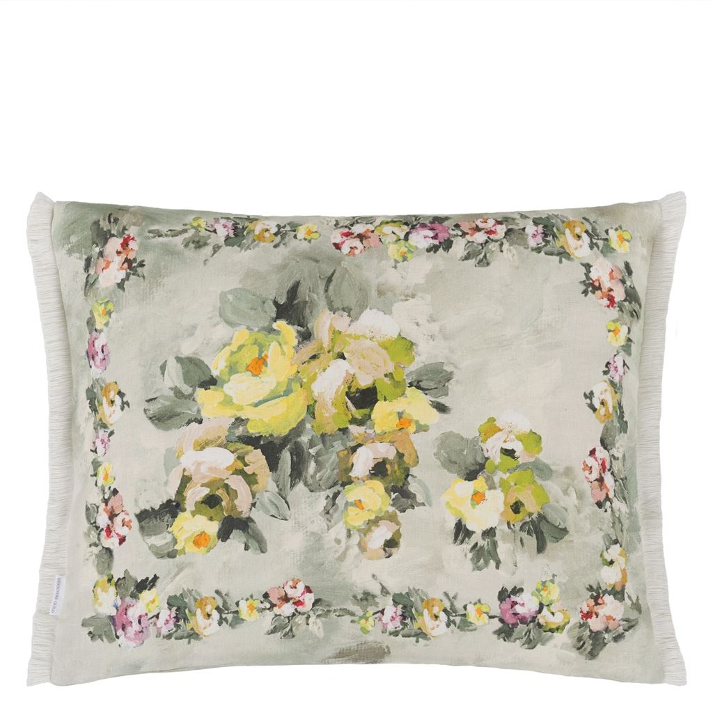 Ghirlanda pyntepute fra Designers Guild. Puten er trykt på vasket lin og har moderne krittfrynser på to sider