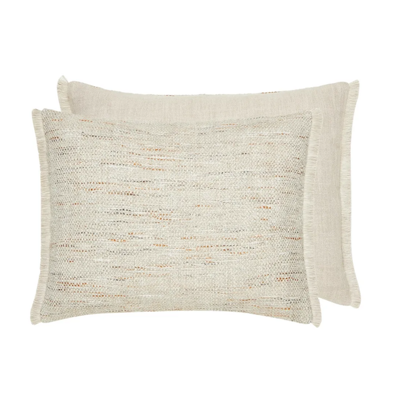 En stilig rektangulær pute laget av et herlig mykt, tungt, teksturert naturlig lin med flekker av fargede garn i kobber, karbon og mose – som fremkaller den barske skjønnheten til korniske granittklipper.