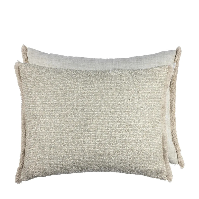 Kintal pyntepute fra Designers Guild. En stor, rektangulære pute irobust og lettstelt bouclé, kombinert med Tamega parchment. Puten har detaljer av børstede frynser på to sider.