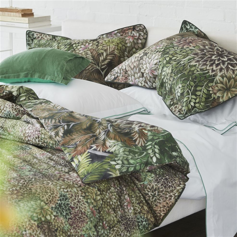 Madhya sengesett fra Designers Guild. Et fantastisk sengetøydesign med lag av grønne trær, blader og løvverk i rike toner av smaragdmose og asurblått. Bakside med bladmønster i mindre skala. Digitalt trykt på ren bomull, 300 T/C.
