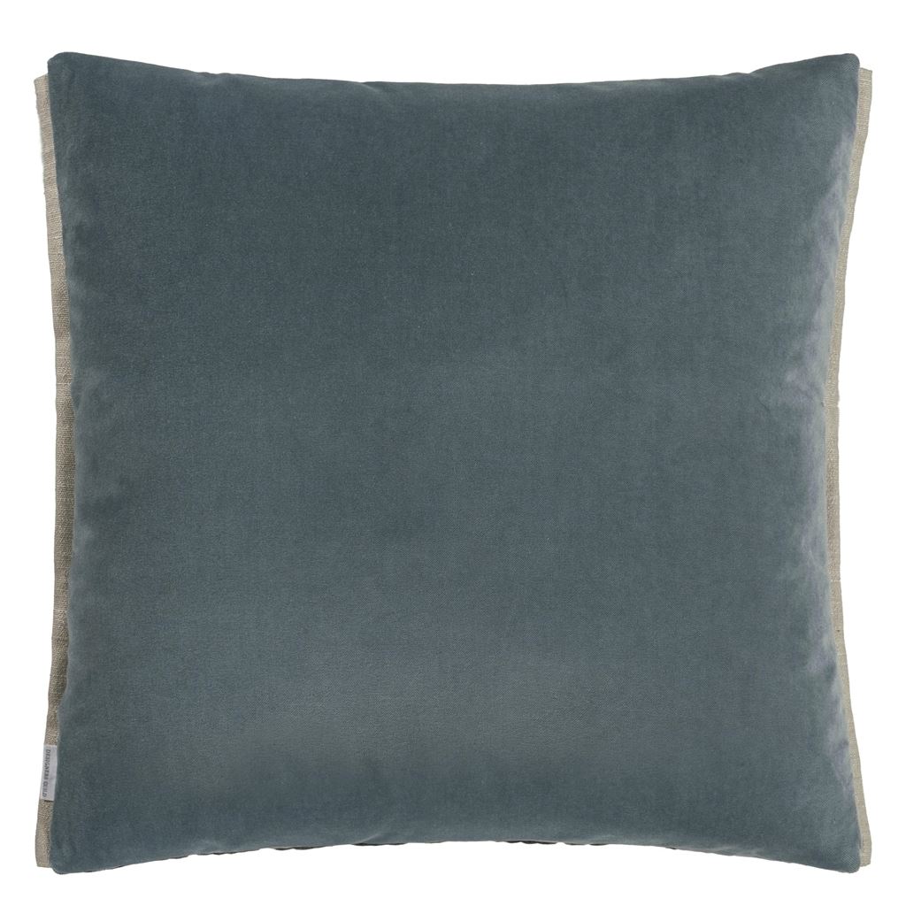 En moderne pute med geometrisk fløyelsmønster og bakside i ensfarget Varese fløyel. Trim på to sider.