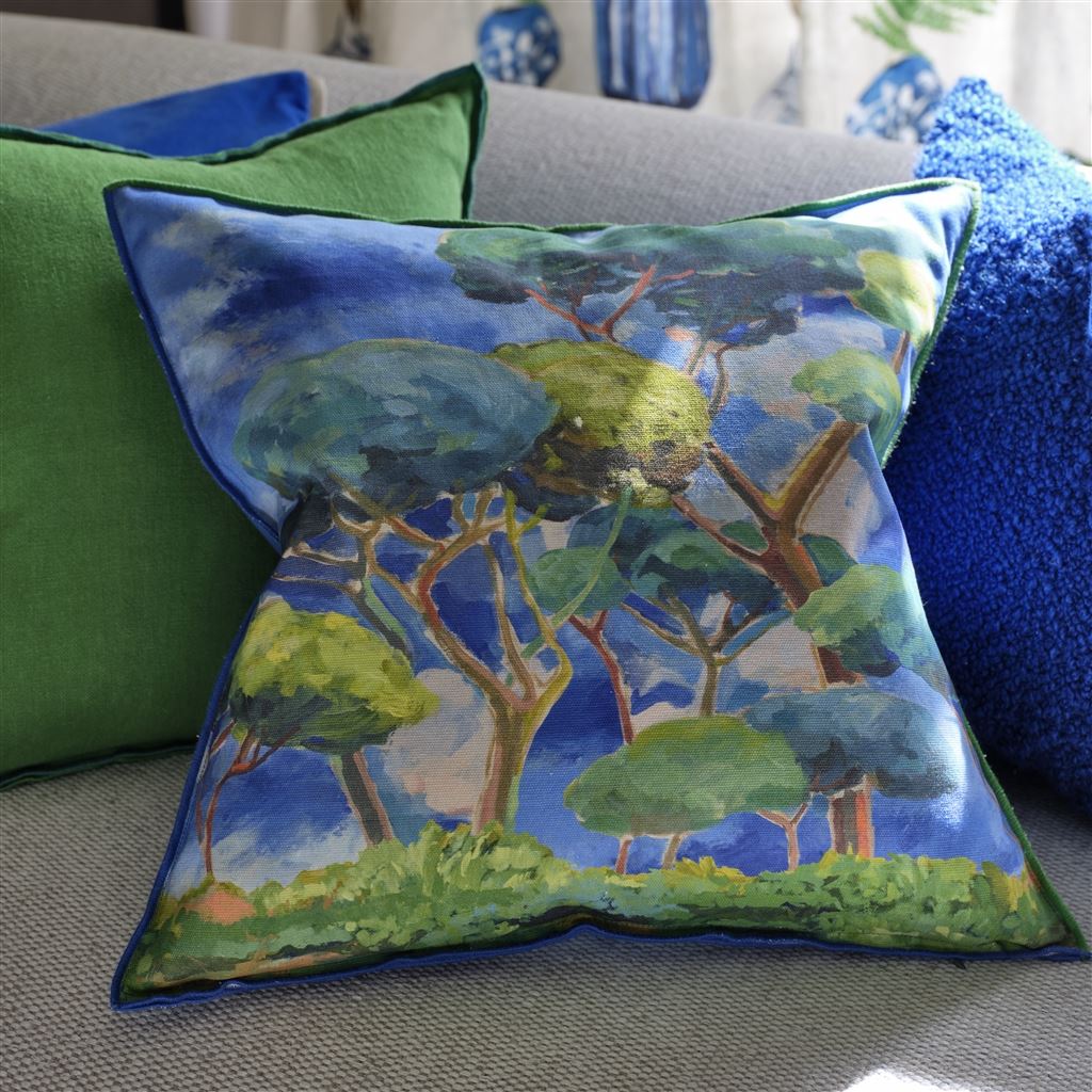 Denne dekorative puten er utsmykket med maleriske, abstrakte skildringer av orientalske furutrær som fanger energien til kunstnerens pensel i levende nyanser. Digitalt trykt på bomull. Bakside som en himmelscene. Overlocket kant på fire sider.