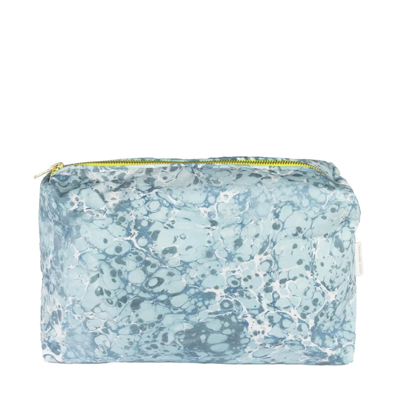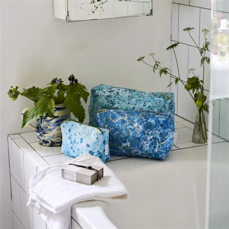 Denne moderne toalettmappen er inspirert av den flere hundre år gamle tradisjonen med marmorering, og kommer i vakre blåtoner. Motivet er digitaltrykket på 100 % bomull, og mappen har et praktisk vanntett fôr på innsiden.