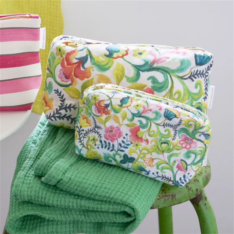 Toalettmappe fra Designers Guild med et livlig og moderne damaskmønster i dype fuksia-toner.. Motivet er digitaltrykket på 100 % bomull, og mappen er utstyrt med et praktisk vanntett fôr