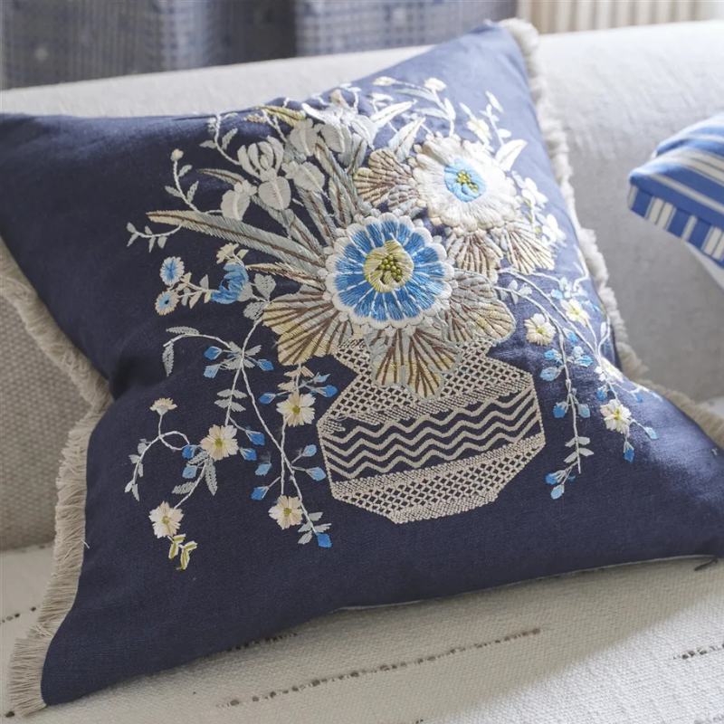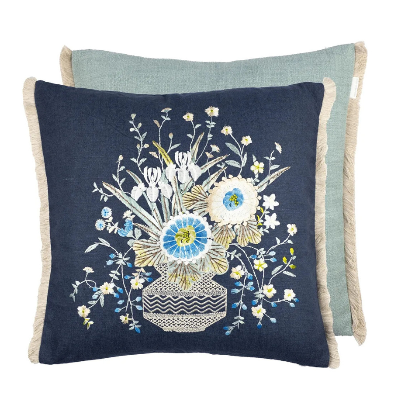 Denne uimotståelige puten vil garantert bli et blikkfang i rommet. Puten har en heldekkende brodert blomsterkurv, med baksiden Carlyon «string». Som en ekstra detalj er den prydet med naturfargede frynser på to av sidene.