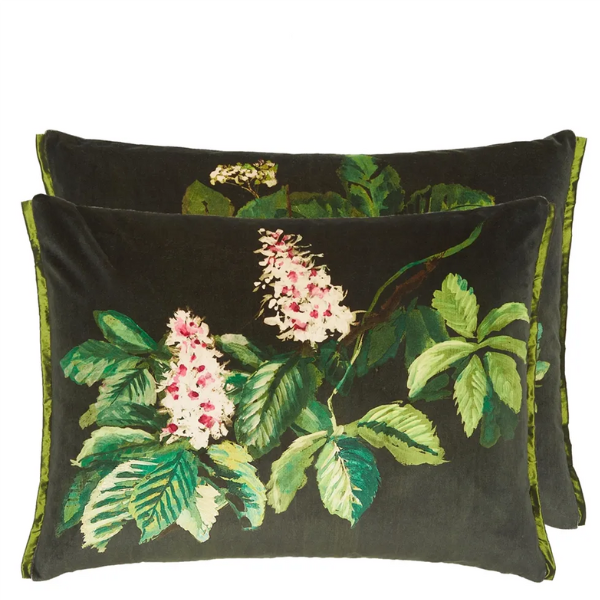 Denne store, rektangulære puten er dekorert med maleriske motiver av hestekastanjeblader og kubjelleblomster, satt mot en dyp indigoblå bakgrunn. Puten er digitalt trykt på luksuriøs fløyel, er fullt vendbar, og er kantet med en Calozzo thyme-bånd på to av sidene.