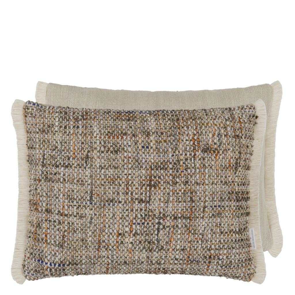 En koselig og dekorativ pute i stoff vevd med en blanding av naturfibre som skaper et nydelig flekket tweed-mønster i nøytrale farger. Ensfarget bakside og frynse på to sider.