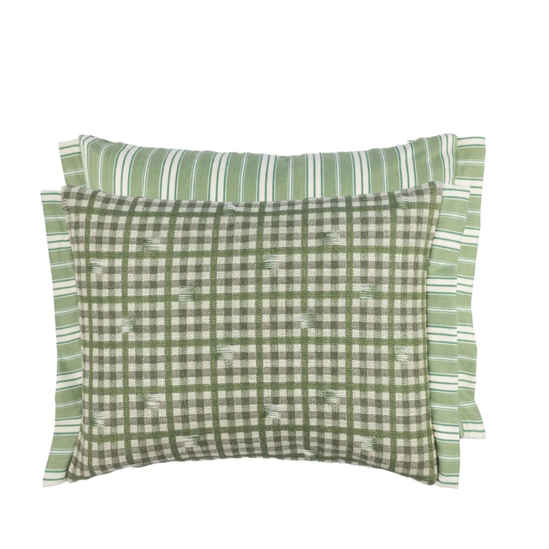 Denne sjarmerende, lille rektangulære puten er laget i en gingham-rutet vev med delikate uttrekkssømmer. Puten har baksiden og kantene prydet med Conduit-striper. Merk at de uttrukkede trådene er en del av designet; man bør derfor være forsiktig så man ikke hekter seg fast i dem eller drar i trådene, slik at skader unngås.