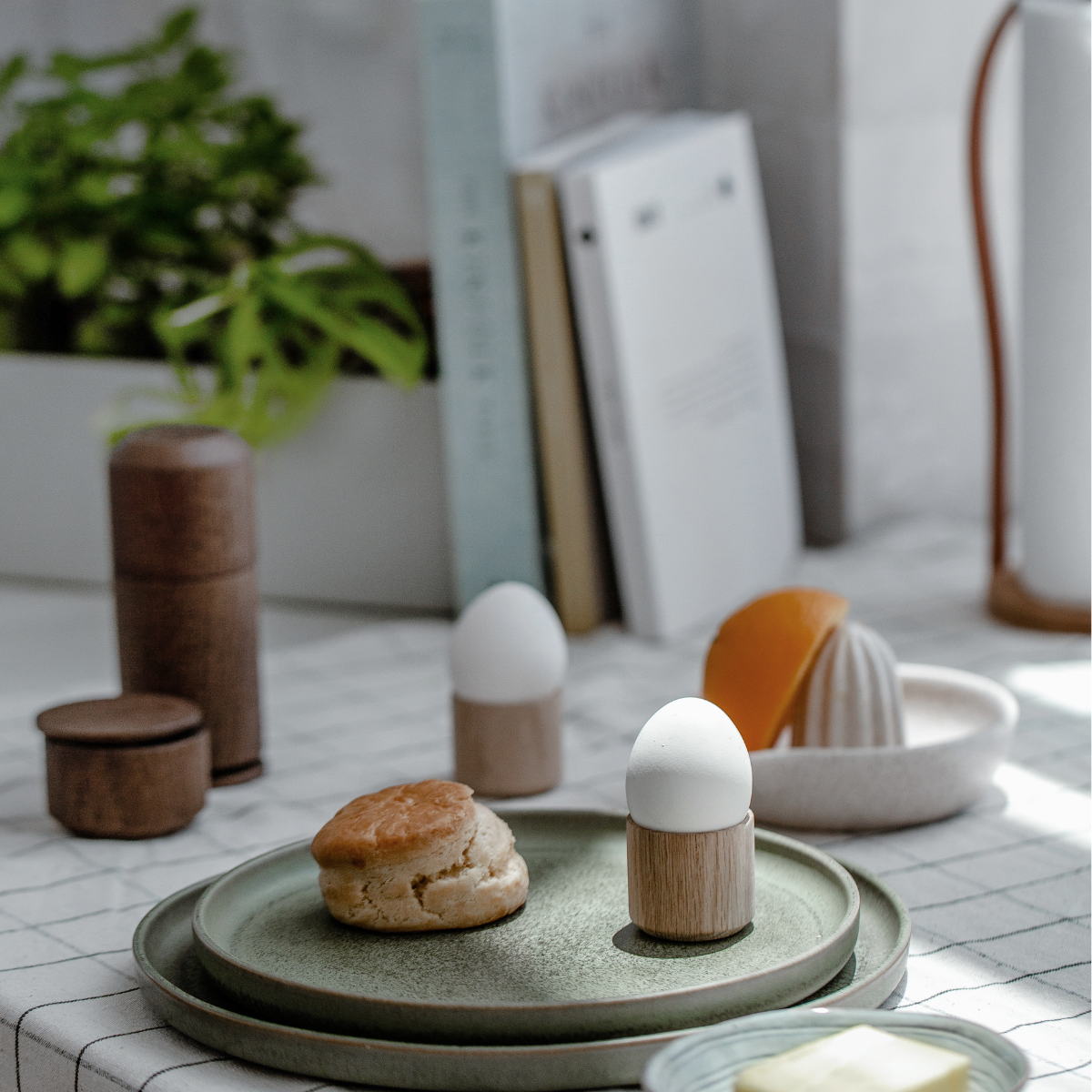 Egg Me er en tidløs klassiker med en moderne kant. Disse eggekoppene i eik har et vakkert organisk utseende og er perfekte for å legge litt seriøs stil på frokostbordet.