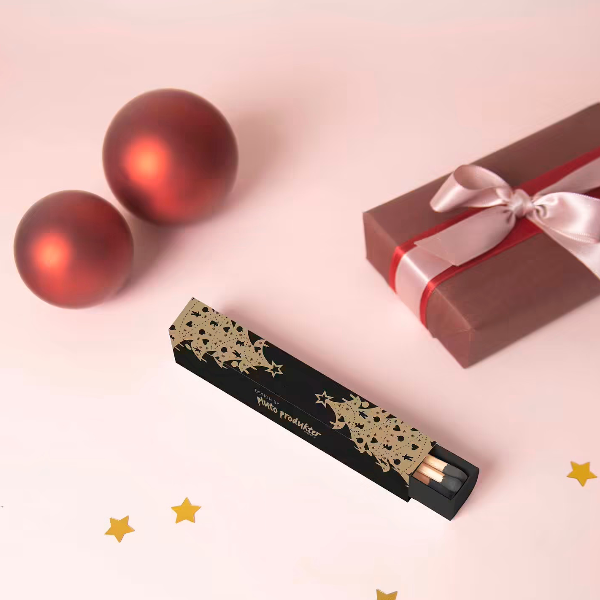 En dekorativ liten eske for fyrstikker fra svenske Pluto. Nydelig forpakning med gullfolietrykk. Perfekt å gi bort sammen med ett englespill eller en lysestake.