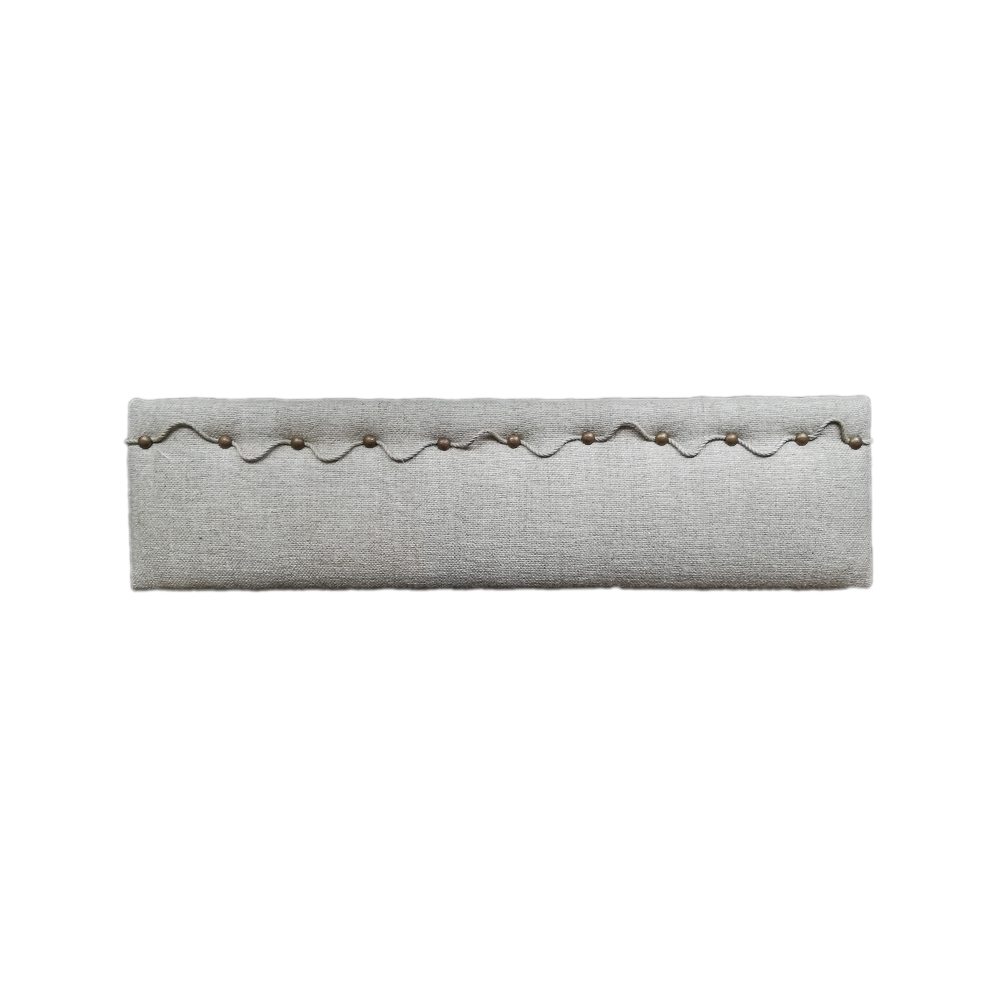 Brillerekke fra Riis Interiørverksted, trukket i et lyst, lin-etterlignende tesktil med hamptau og små nagler.