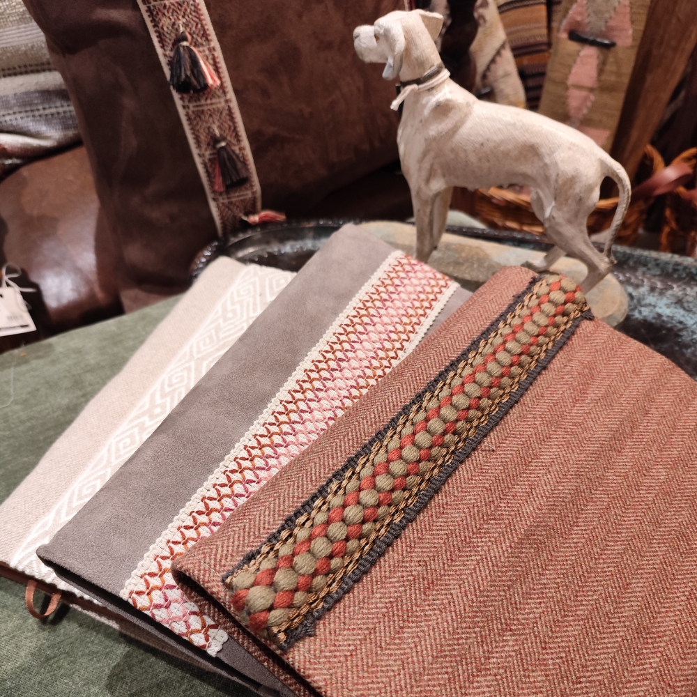 Omslag til hyttebok med trim fra Samuel & Sons, laget av Riis Interiørverksted. Standard utførelse som vist på bilde. Prisen inkluderer innmat; standard «Grieg Hyttebok»