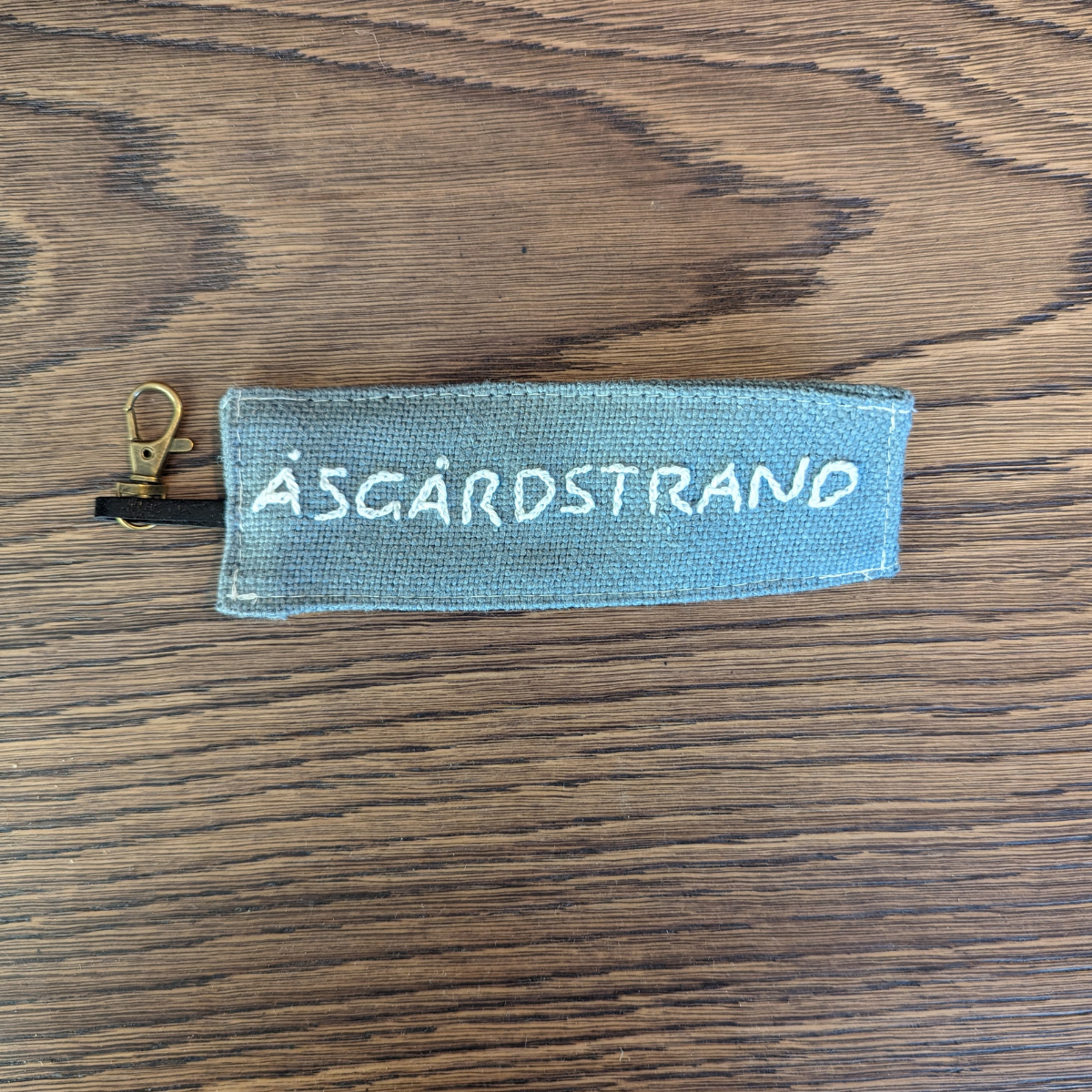 Nøkkelring med tekst fra Riis Interiørverksted. Brodert tekst på beige lin med skinnanheng og nøkkelkrok
