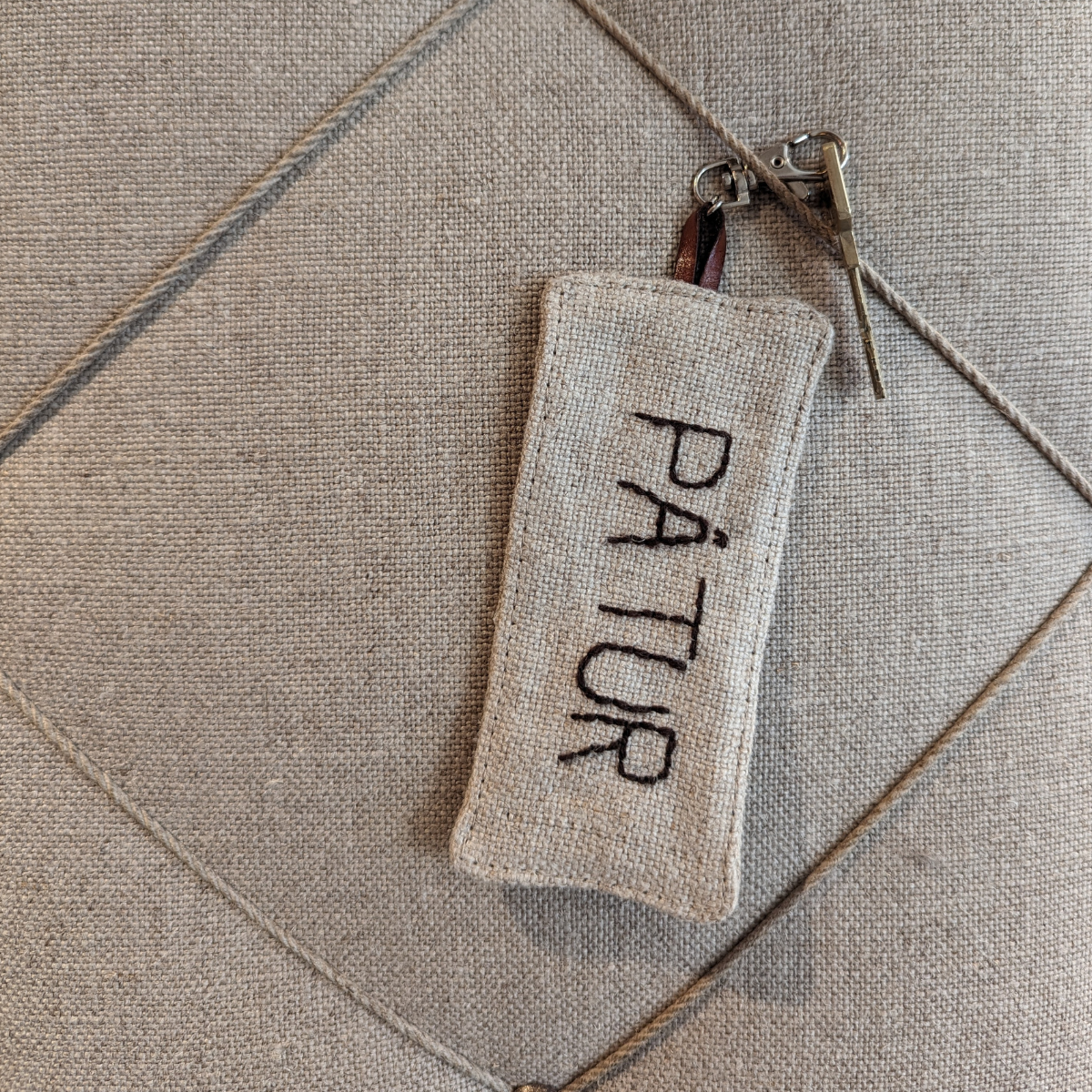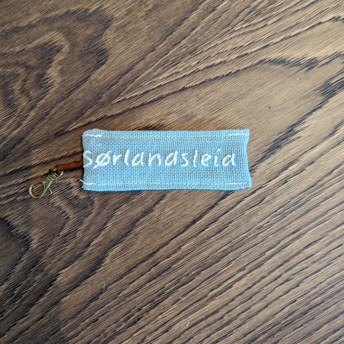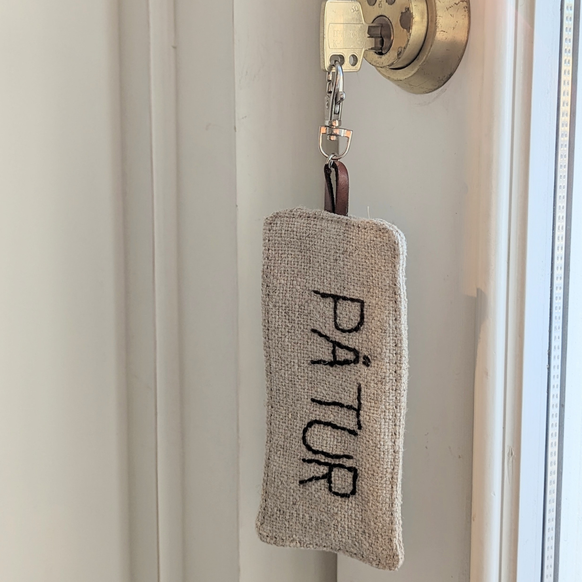Nøkkelring med tekst fra Riis Interiørverksted. Brodert tekst på beige lin med skinnanheng og nøkkelkrok