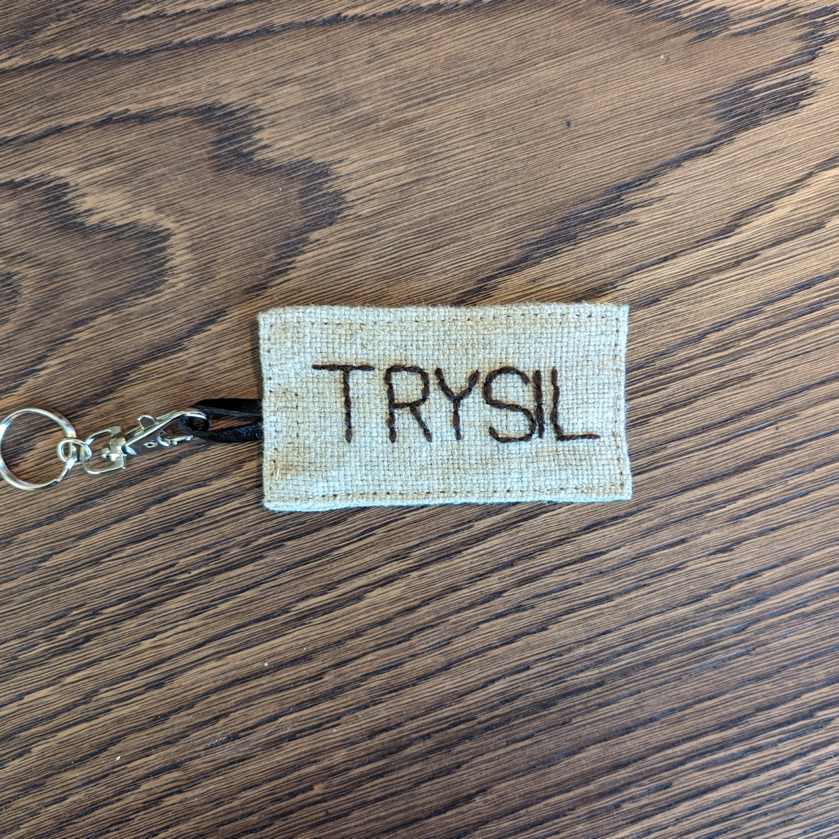 Nøkkelring med tekst fra Riis Interiørverksted. Brodert tekst på beige lin med skinnanheng og nøkkelkrok