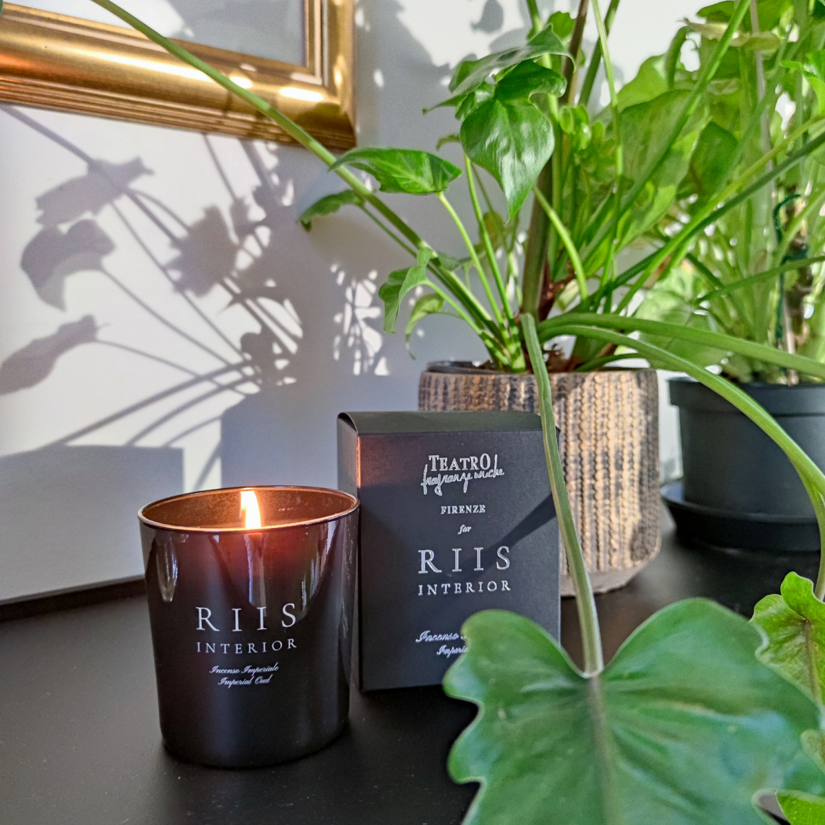 Scented candle / duftlys fra Teatro Fragrance for Riis Interiør. Den nydelige, orientalsk duften av musk og krydder passer for både den maskuline og feminine smak. Bakgrunnen for valg av duft var å finne en som både passer til hjem, fjellhytte og sommerhus, og som behager nesen på samme måte som Holiday candle fra Ralph Lauren Home.