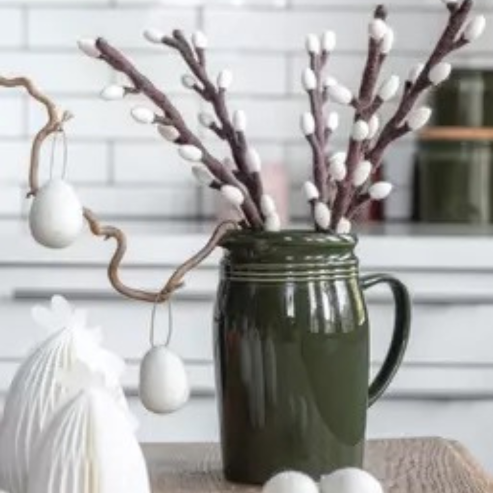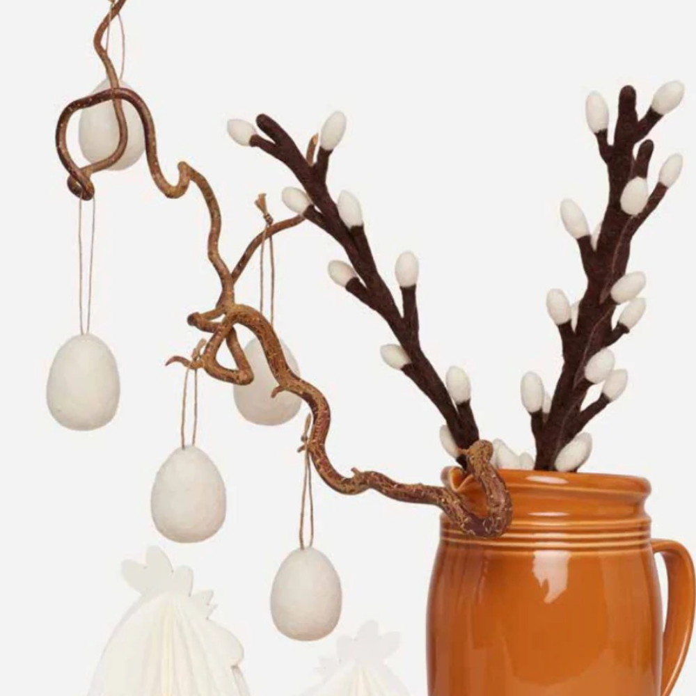 Flott dekorasjonskvist med gåsunger i ull. Kvisten kan legges på et fat eller settes i en vase. Fin alene og fin sammen med flere.