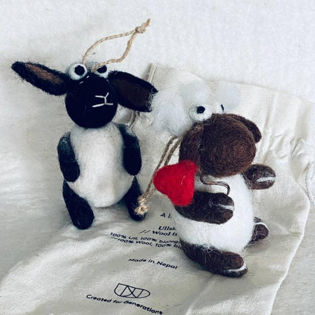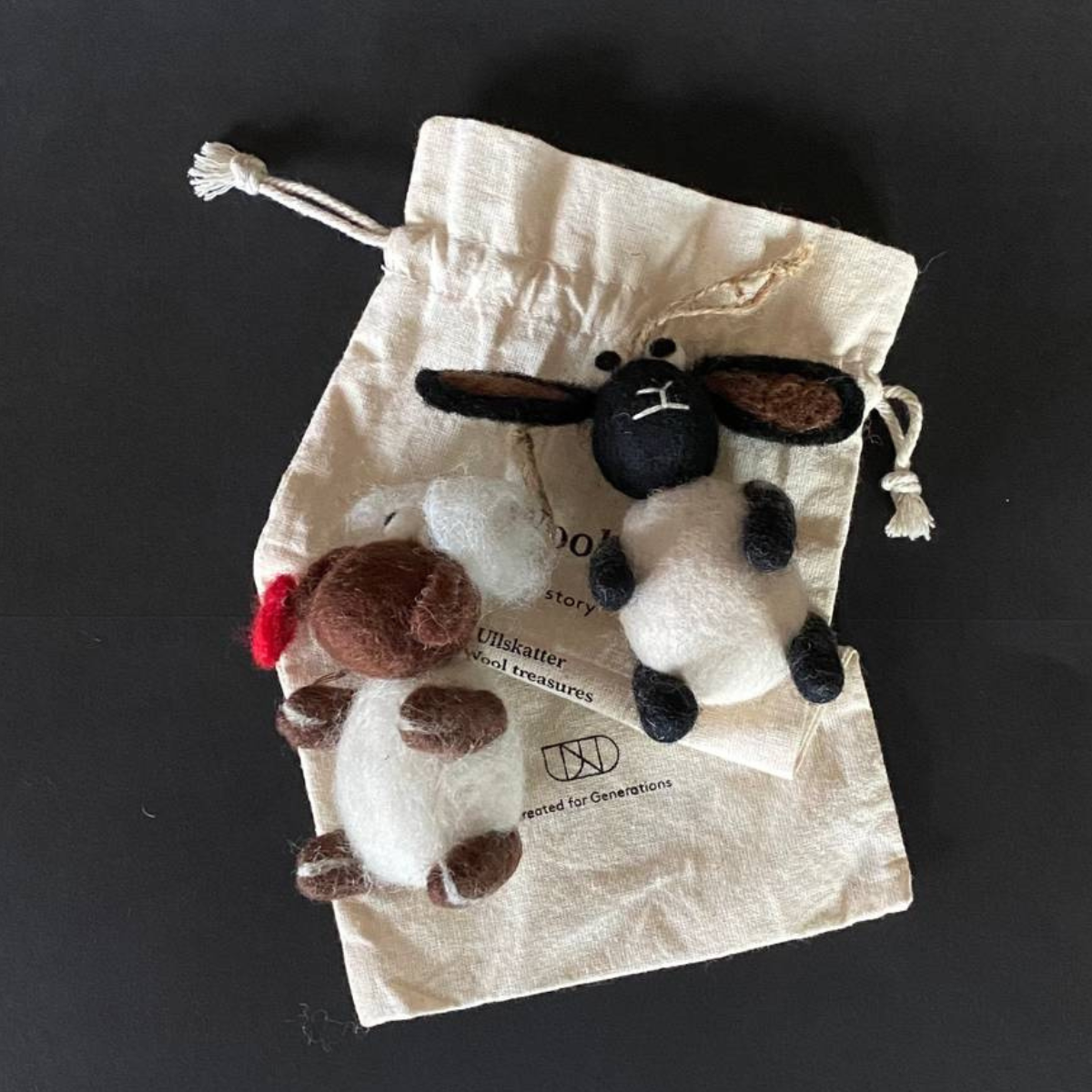 To søte påskelam laget av ullfilt fra norske Und. Kommer i en praktisk tøypose for oppbevaring når ikke i bruk.